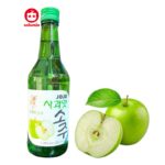 Licor coreano destilado de arroz sabor manzana, presentación de 360 ml, caja por 20 unidades. Venta exclusiva para mayores de edad.